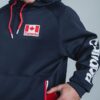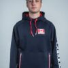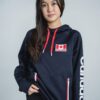 Retro vibe in a pull over hoodie with a full coverage hood and zipper pockets.